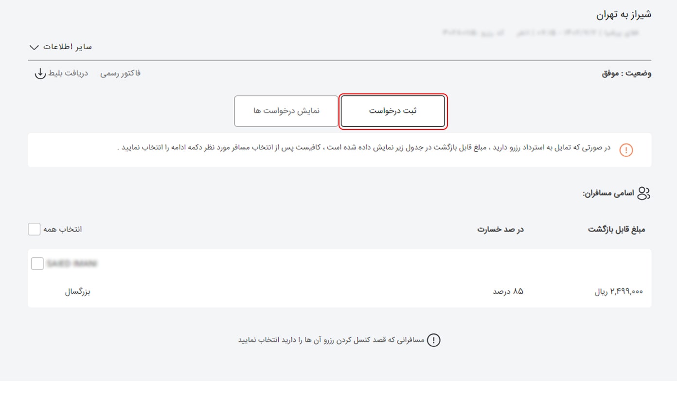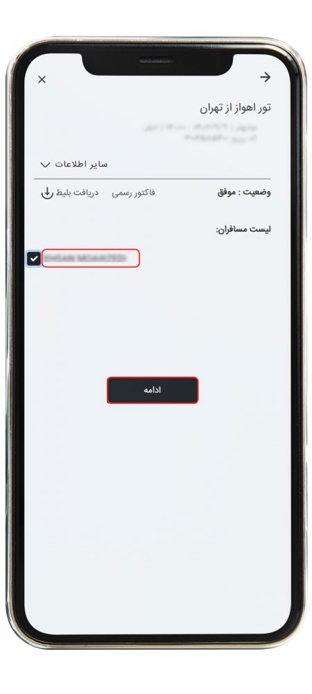 سپس مسافر یا مسافرین را انتخاب کرده و روی گزینه "ادامه" کلیک کنید.