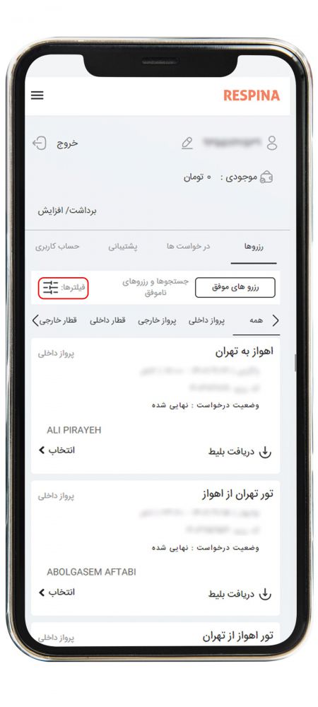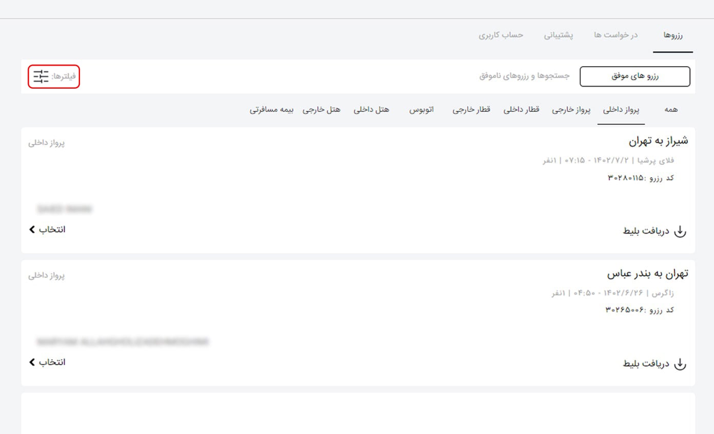 برای دسترسی سریع تر به بلیط مد نظر می توانید از فیلترها کمک بگیرید. در سمت چپ و بالای لیست بلیط ها، گزینه فیلتر قابل مشاهده است. روی آن کلیک کرده و در صفحه باز شده یکی از اطلاعات خواسته شده شامل کد رزرو، مبدا، مقصد، تاریخ رفت یا برگشت را وارد کنید و روی "فیلتر" کلیک نمایید.