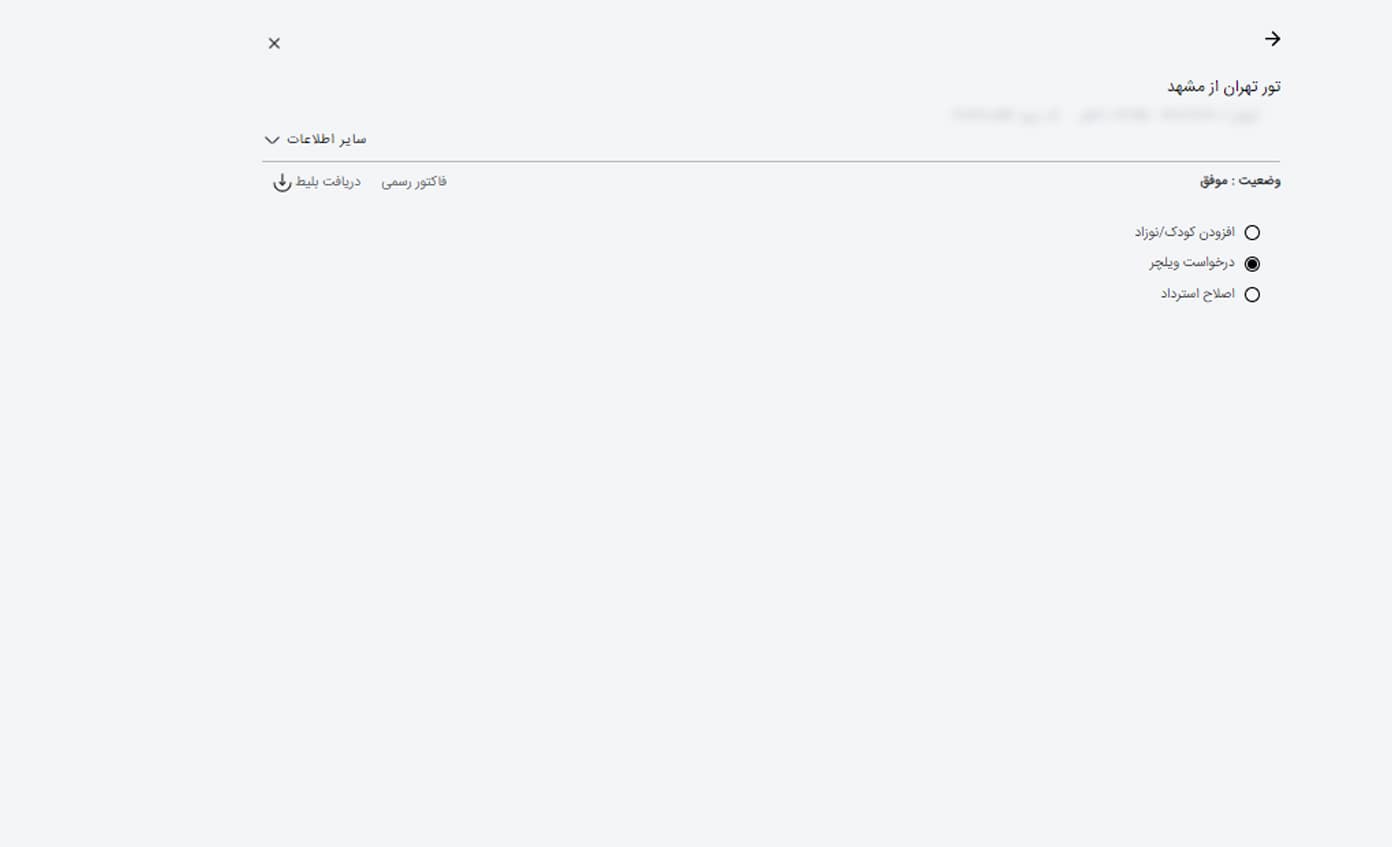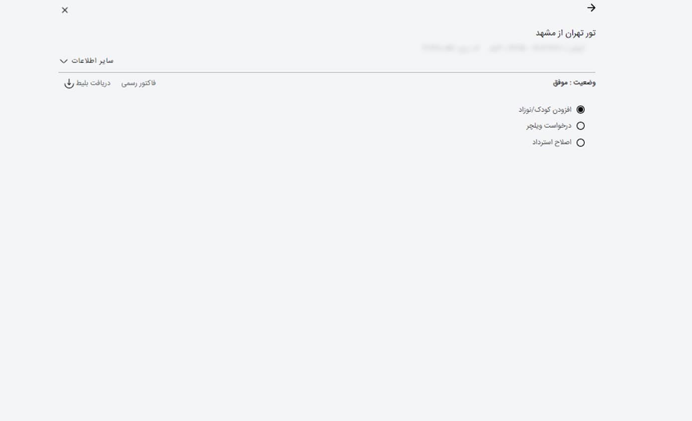 در این صفحه می توانید خدمات مربوط به پرواز خود را مشاهده کنید. این خدمات شامل "افزودن کودک یا نوزاد، "درخواست ویلچر" و "اصلاح استرداد" می شود. اگر قصد افزودن، مسافر کودک یا نوزاد را دارید، گزینه "افزودن کودک / نوزاد" را انتخاب کنید.