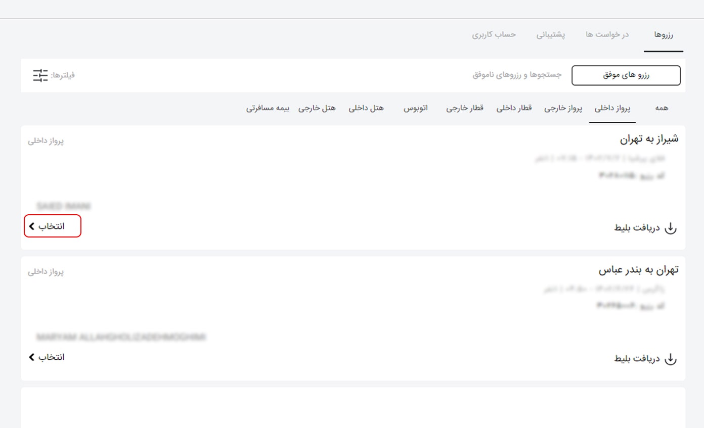 در کادر مربوط به هر بلیط جزئیاتی مانند مسیر پروازی، شرکت هواپیمایی ارائه کننده پرواز، تاریخ و ساعت رزرو، تعداد و نام مسافرین و کد رزرو درج شده است. پس از پیدا کردن بلیط روی آن کلیک کنید یا روی گزینه "انتخاب" کلیک کنید.